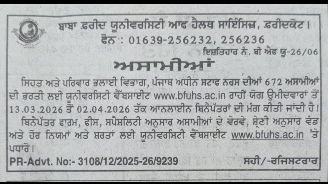 Baba Farid University of Health Sciences (BFUHS)672 Staff Nurse Recruitment 2026Advt No. : BFUHS(BFU-26/06) Short DetailsWWW.PUNJABJOBVACANCY.COM |