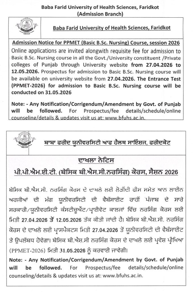 Baba Farid University of Health Sciences (BFUHS)BFUHS PPMET For B.Sc. Nursing Course Admission 2026Online Application for BSc Nursing 2026 Entrance TestWWW.PUNJABJOBVACANCY.COM |